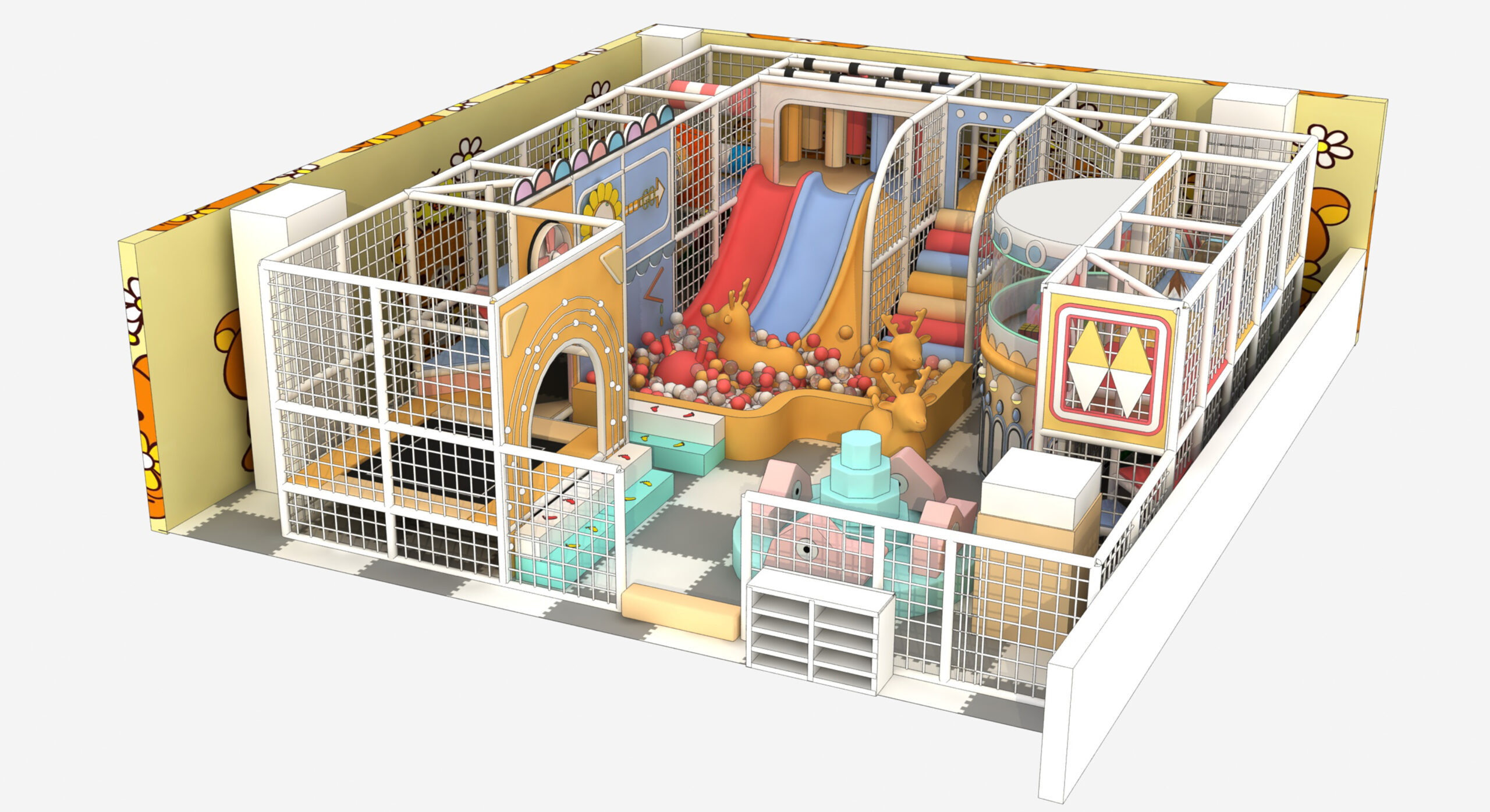 This 100-square-meter indoor soft play area is designed specifically for toddlers and preschoolers, and includes a ball pit, slides, trampolines, and more. While compact, it ensures ample safety, and custom layouts, themes, and color options are available to suit different interior spaces and business needs.
