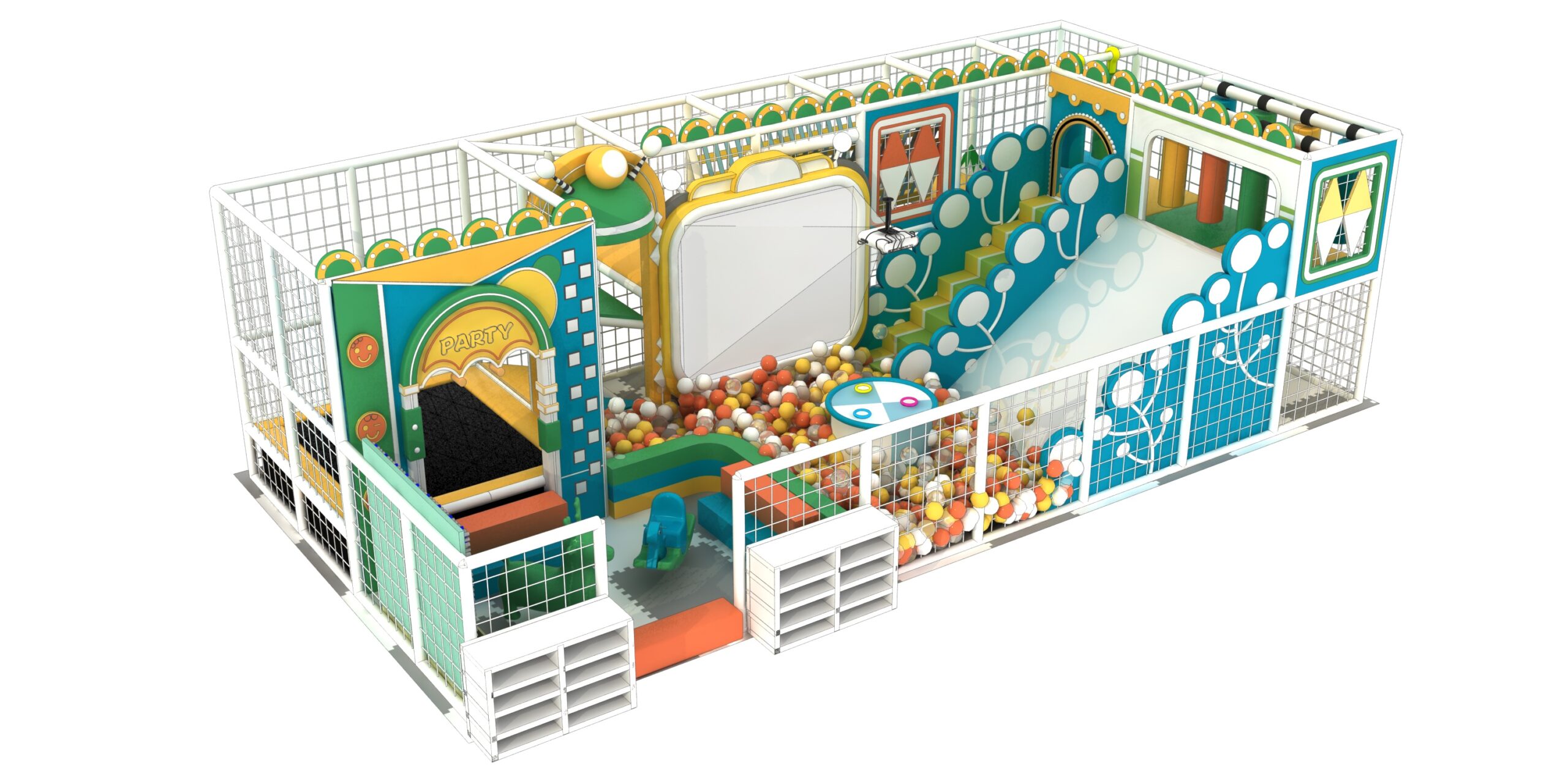 A: It includes a framed maze area, sand pit area, soft pack expansion area, ball pit area, etc.