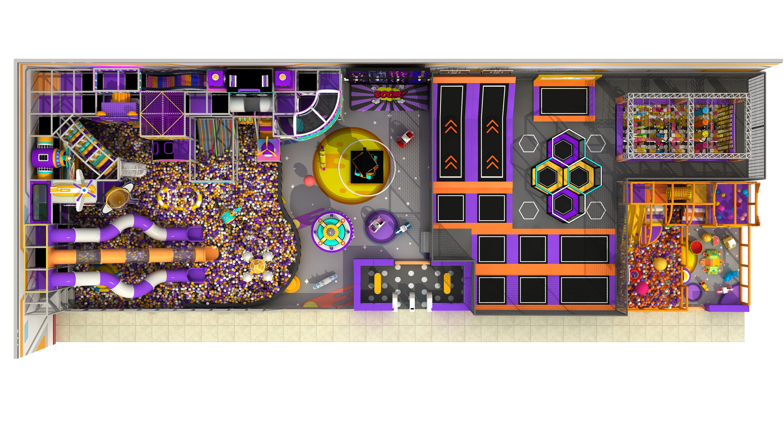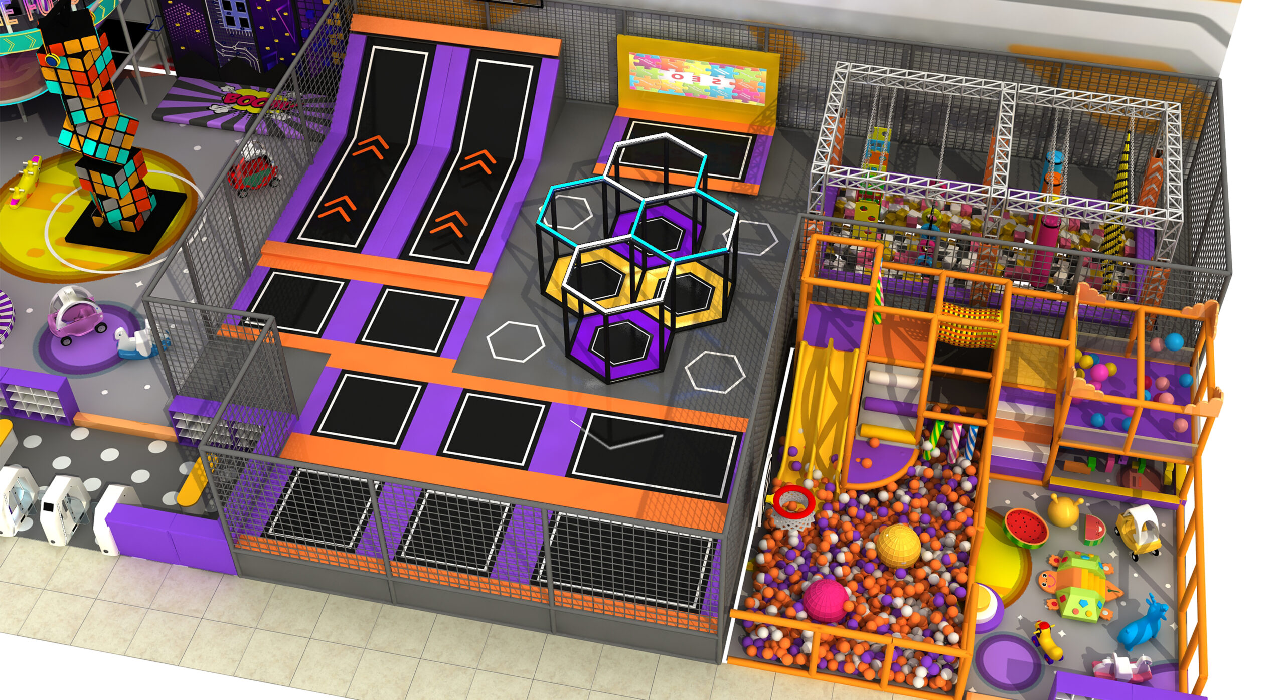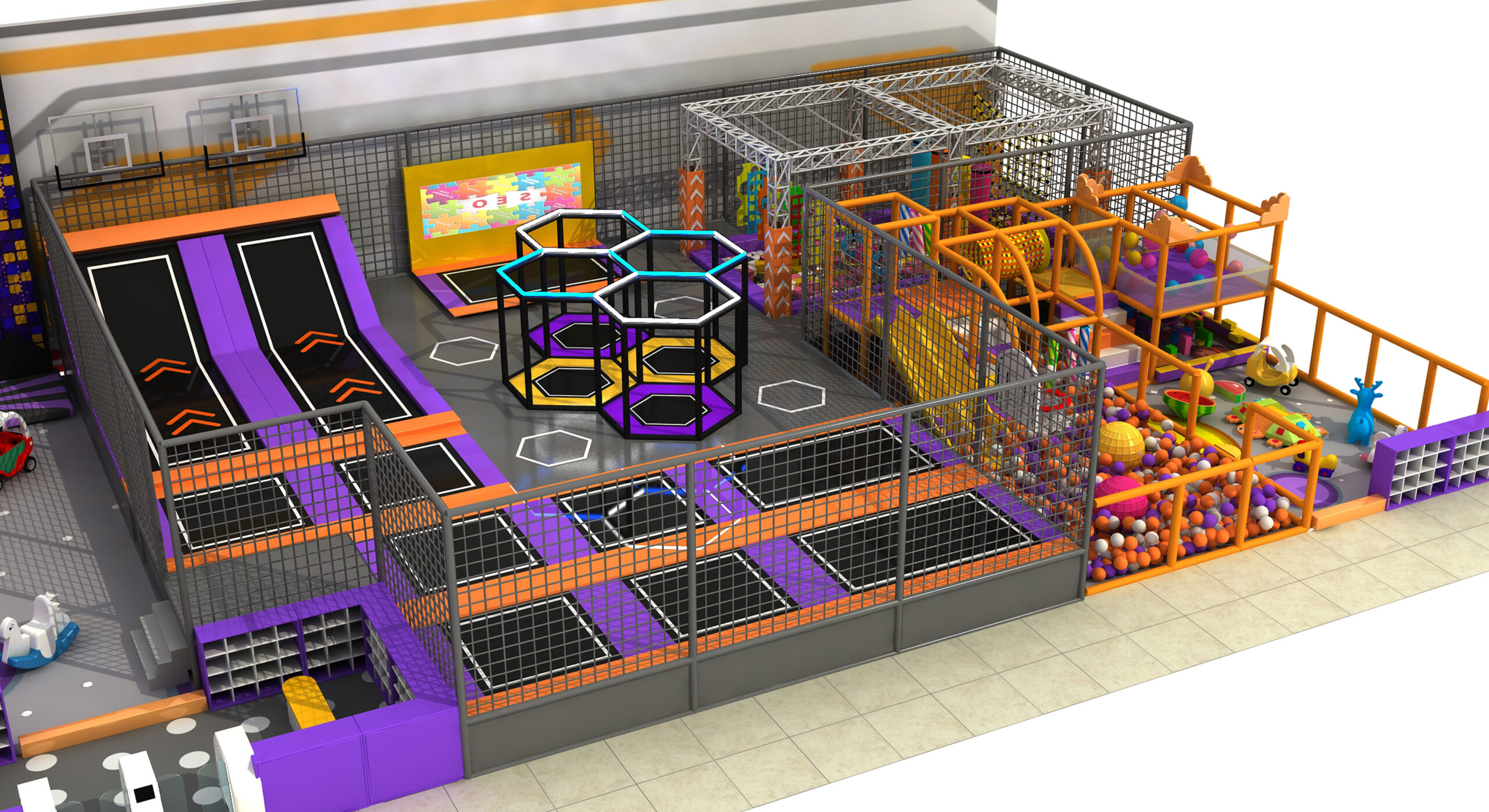 A: It includes a framed maze area, sand pit area, soft pack expansion area, ball pit area, etc.