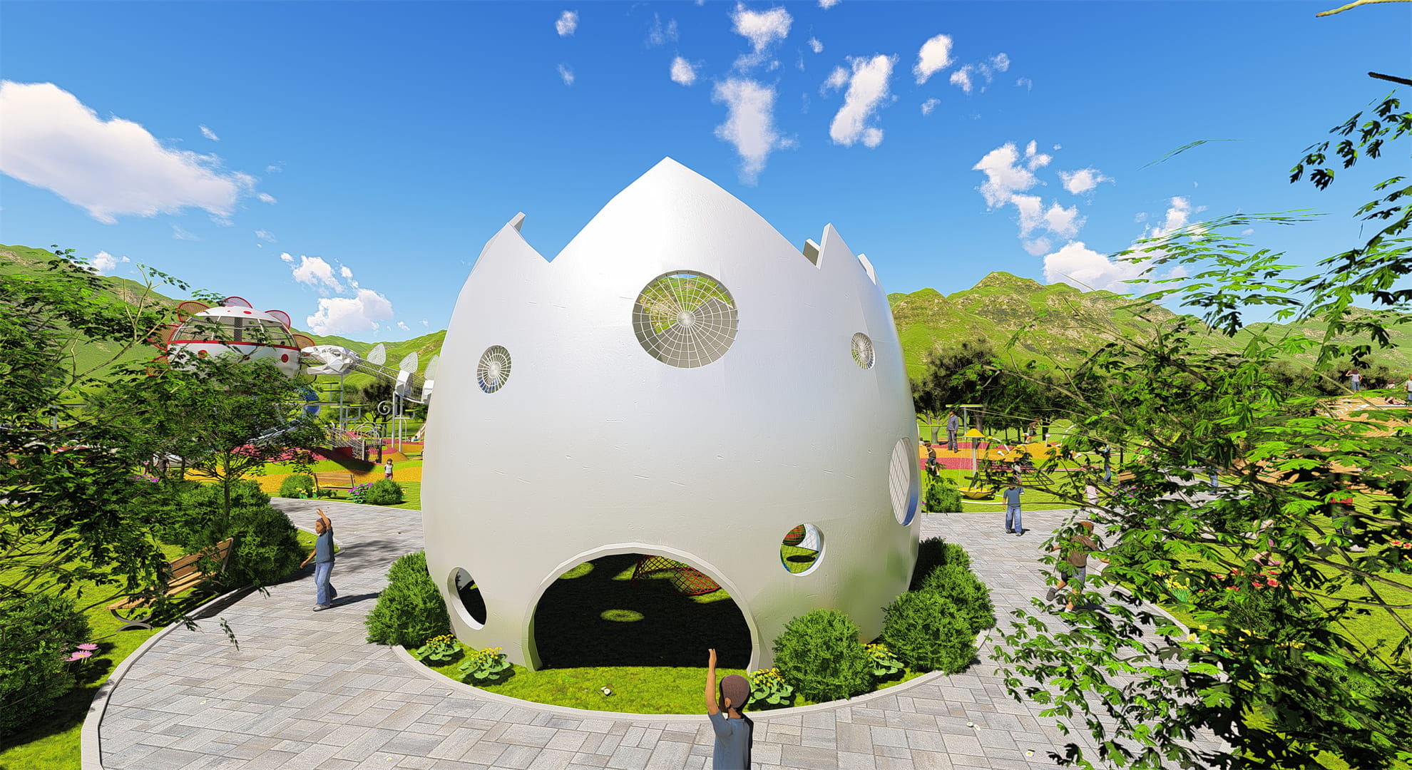 This is a dinosaur fossil adventure park. We will take you back to the prehistoric era to experience the mystery and magnificence of ancient times. Driving into the park, the first thing that comes into view is an eggshell-shaped ticket office, welcoming every visitor to enter this unique time tunnel. Next, you will pass a dinosaur sculpture security gate, whose design is inspired by ancient dinosaur totems.