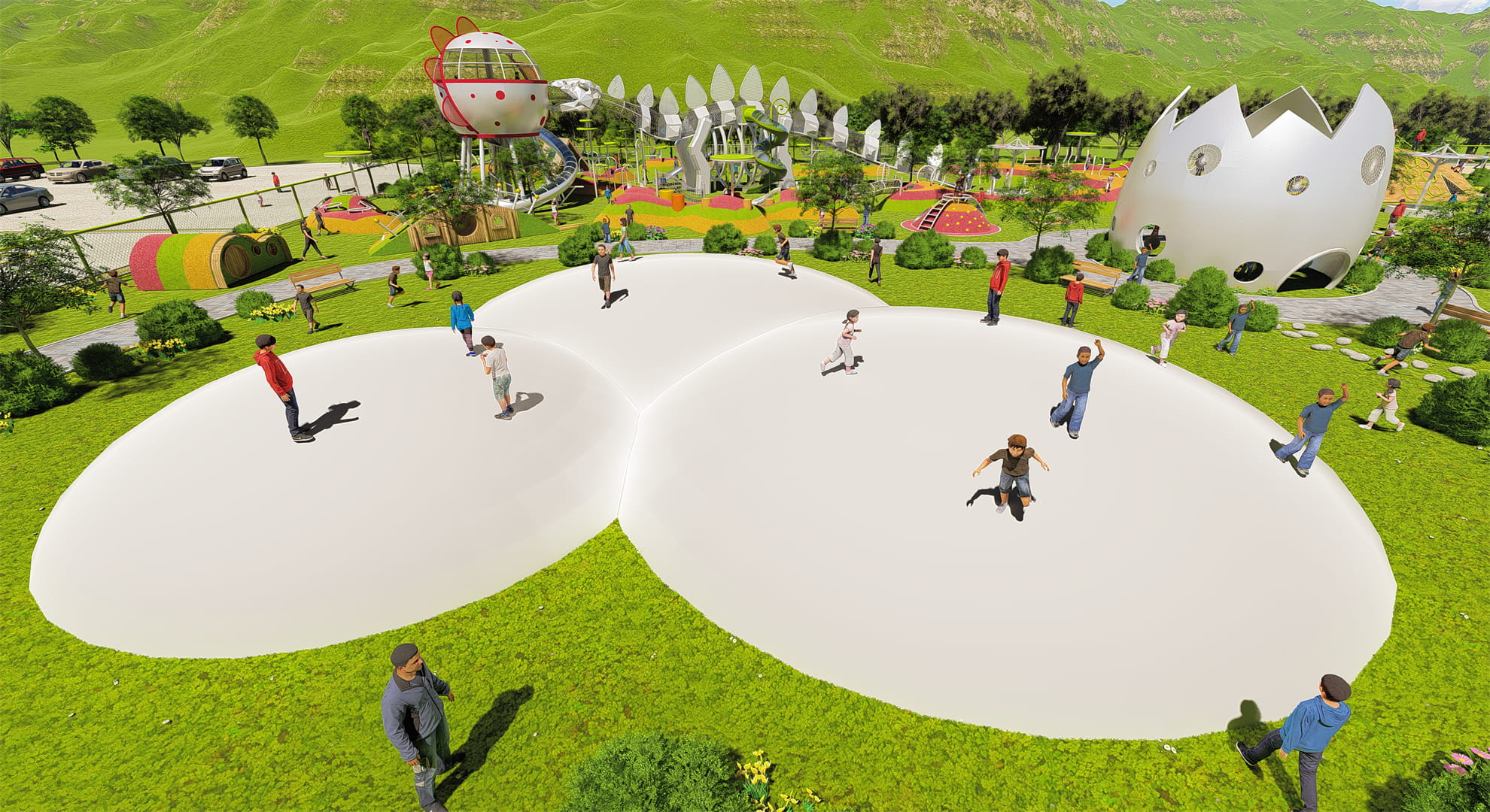 Going forward, you will find a huge eggshell-shaped climbing net, which is not only a paradise for children, but also a great photography spot for parents. Going forward, a large stegosaurus skeleton climbing net slide combination comes into view. Its spectacular design seems to be telling the story of ancient dinosaurs. This facility is not only a perfect combination of climbing and sliding, but also allows children to shuttle inside the dinosaur through its meticulous carving and design, so as to better understand dinosaurs.