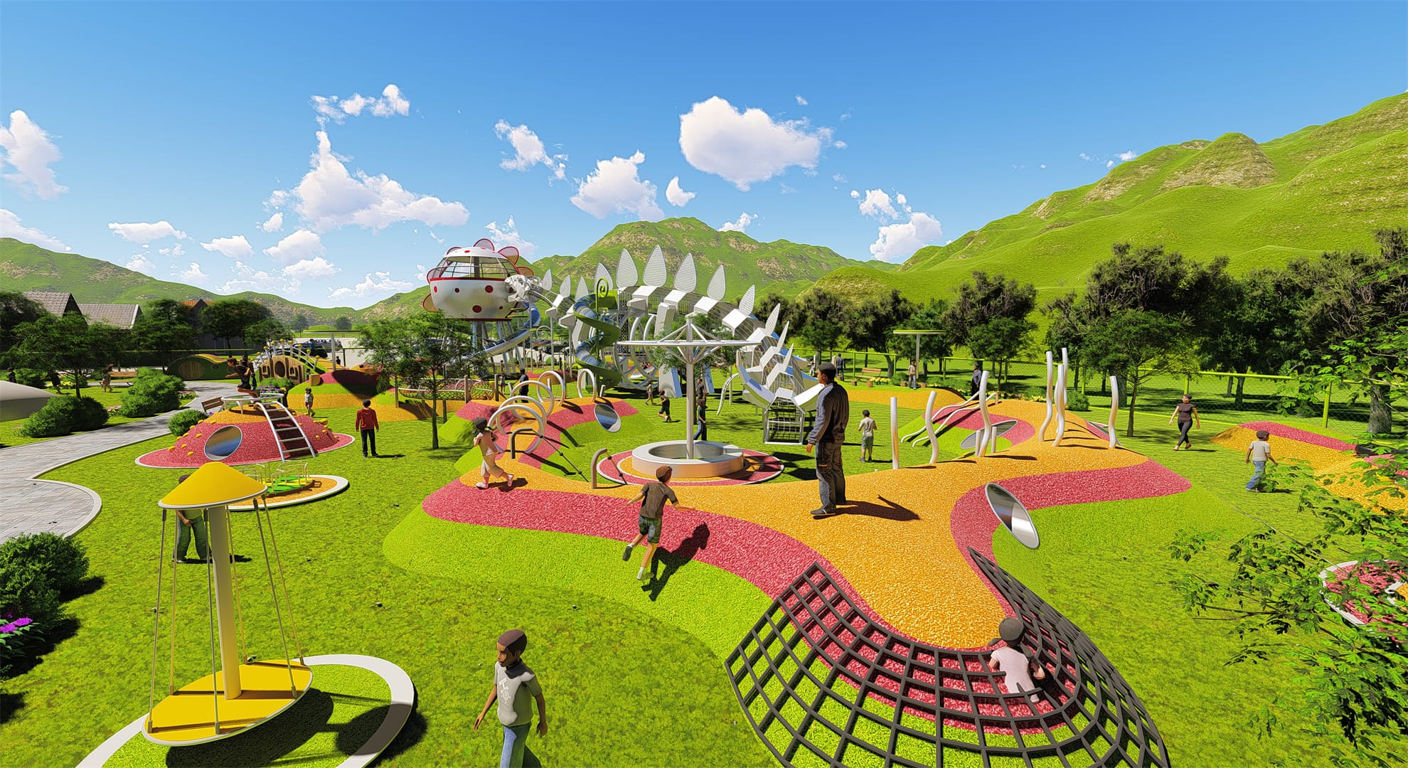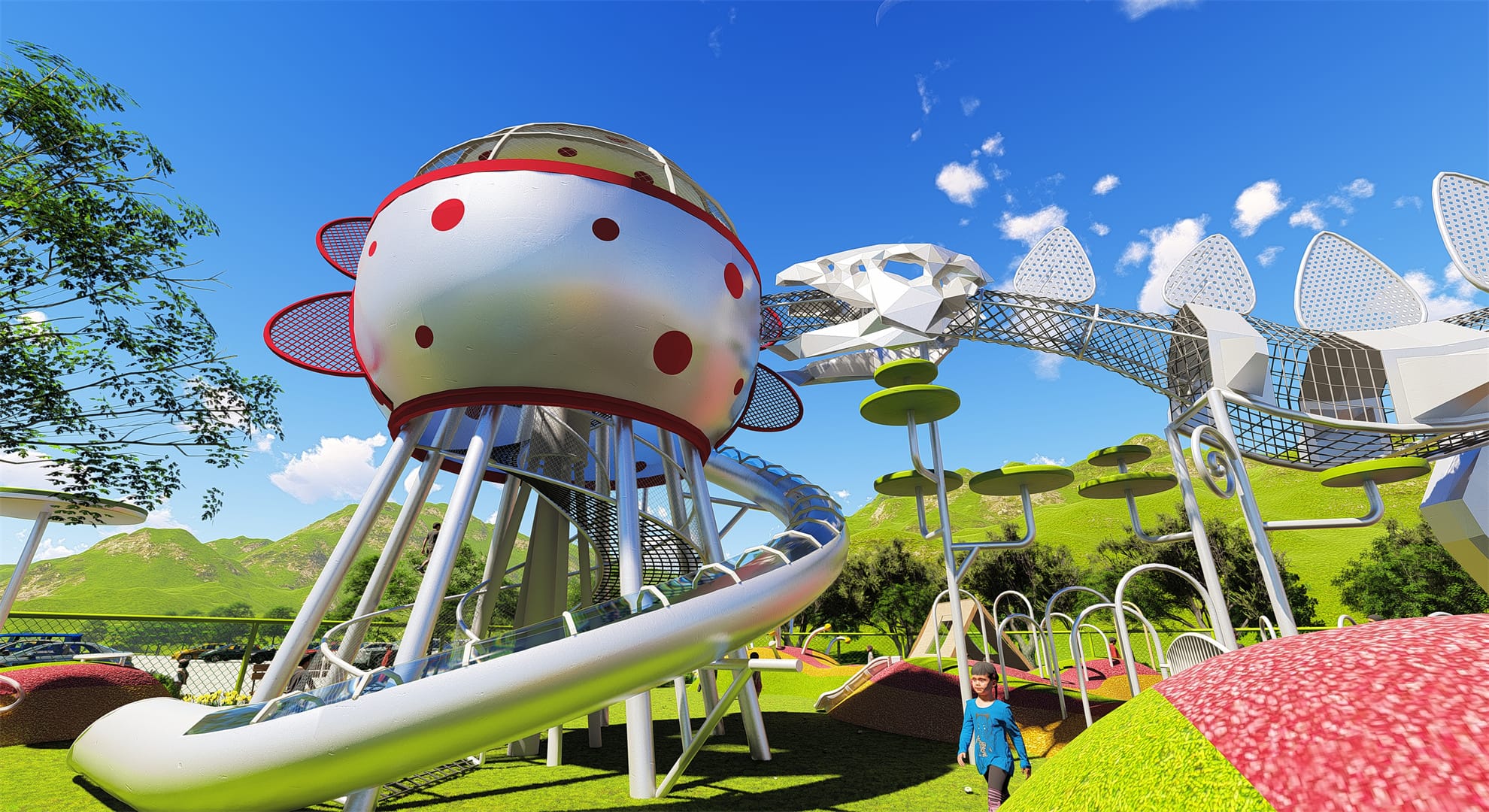 After entering the park, you will see a small flower bed with a Tyrannosaurus Rex skeleton sculpture. This is not just an ordinary landscape decoration. It perfectly displays the magnificent momentum of dinosaurs through the meticulous skeleton structure, providing visitors with an opportunity to get to know dinosaurs up close. Continue forward and you will find a climbing mesh structure imitating the Fuxian Lake worm, which provides children with a unique experience to learn about the ancient world while playing.