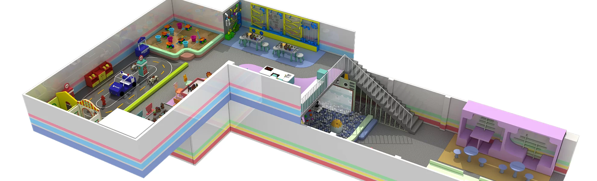 A: It includes a framed maze area, sand pit area, soft pack expansion area, ball pit area, etc.
