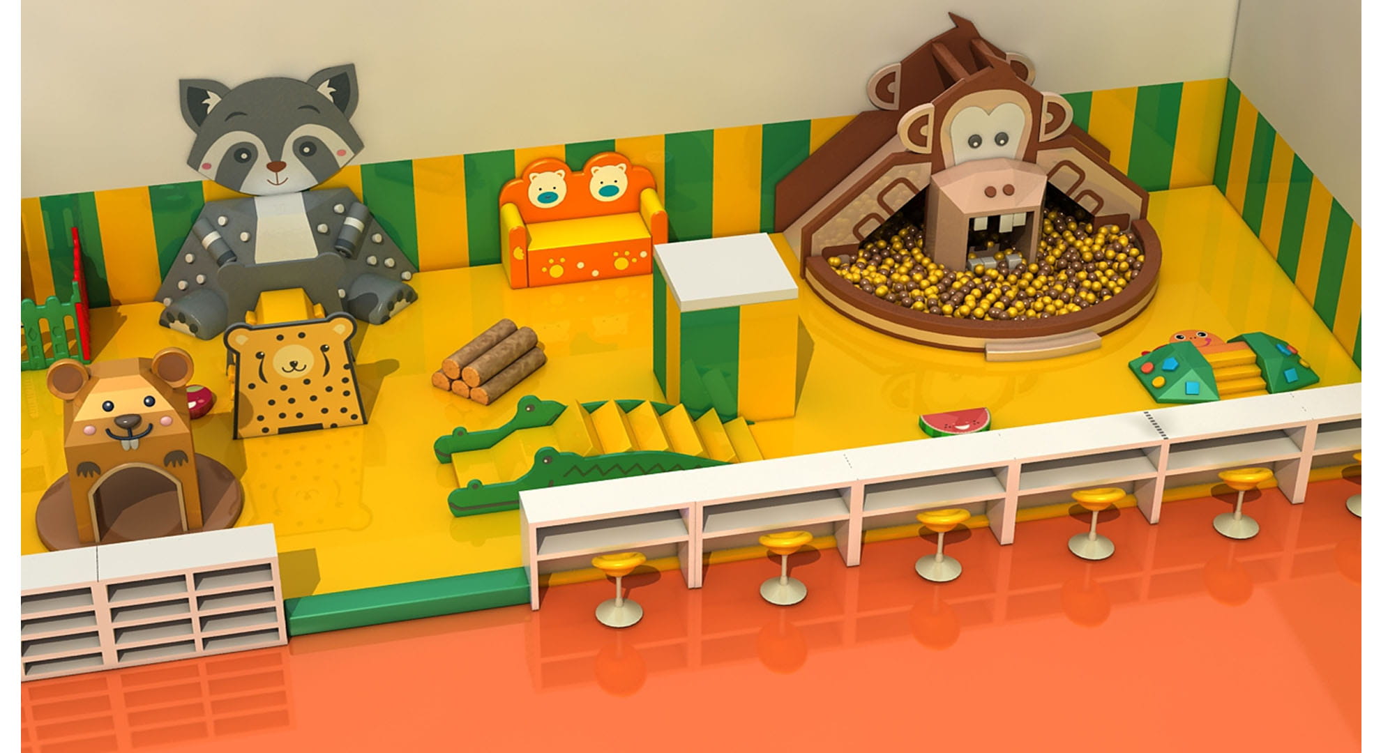 Obviously, the topic of the amusement park is jungle. The playground possesses a ball pit of middle size, a monkey slide, a climbing structure, and a considerable number of other entertainment facilities.