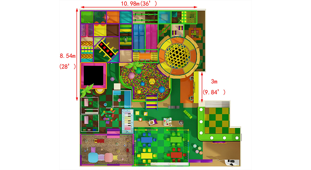 A: It includes a framed maze area, sand pit area, soft pack expansion area, ball pit area, etc.