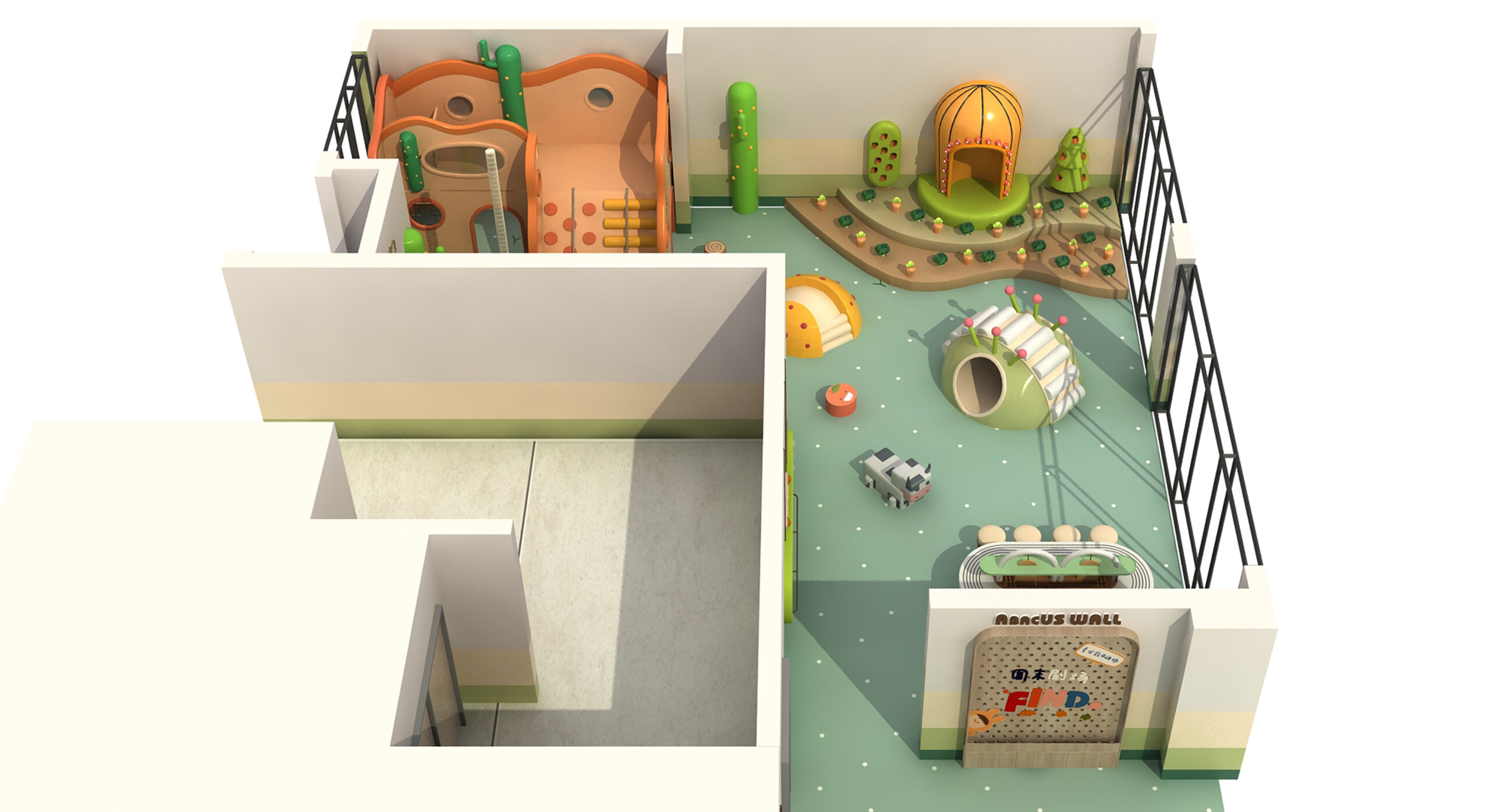 A: It includes a framed maze area, sand pit area, soft pack expansion area, ball pit area, etc.