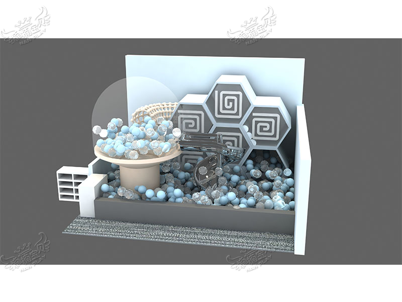 This playground adopts a futuristic design, featuring geometric shapes and a soothing blue-and-white color scheme to create a modern and fun play area. At its center is a large ball pit filled with soft blue and white balls, providing a safe and comfortable environment for children. The back wall, adorned with hexagonal spiral patterns, adds visual depth and enriches the overall aesthetic.