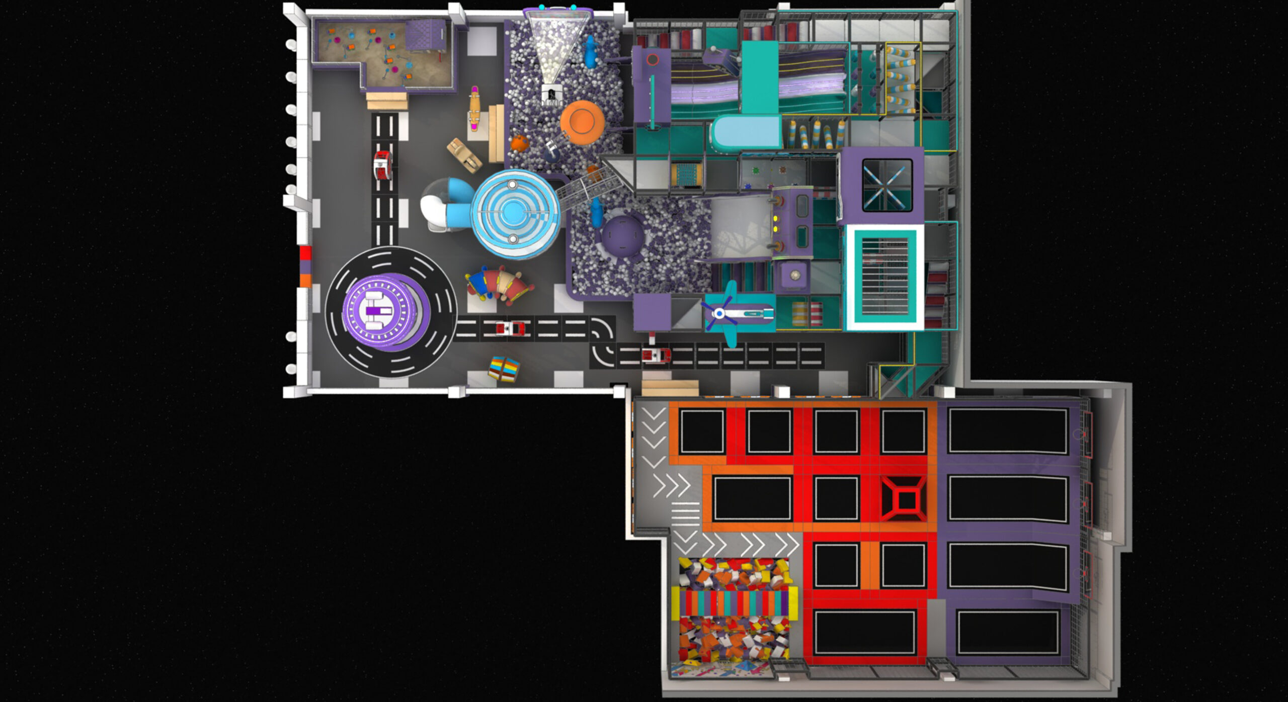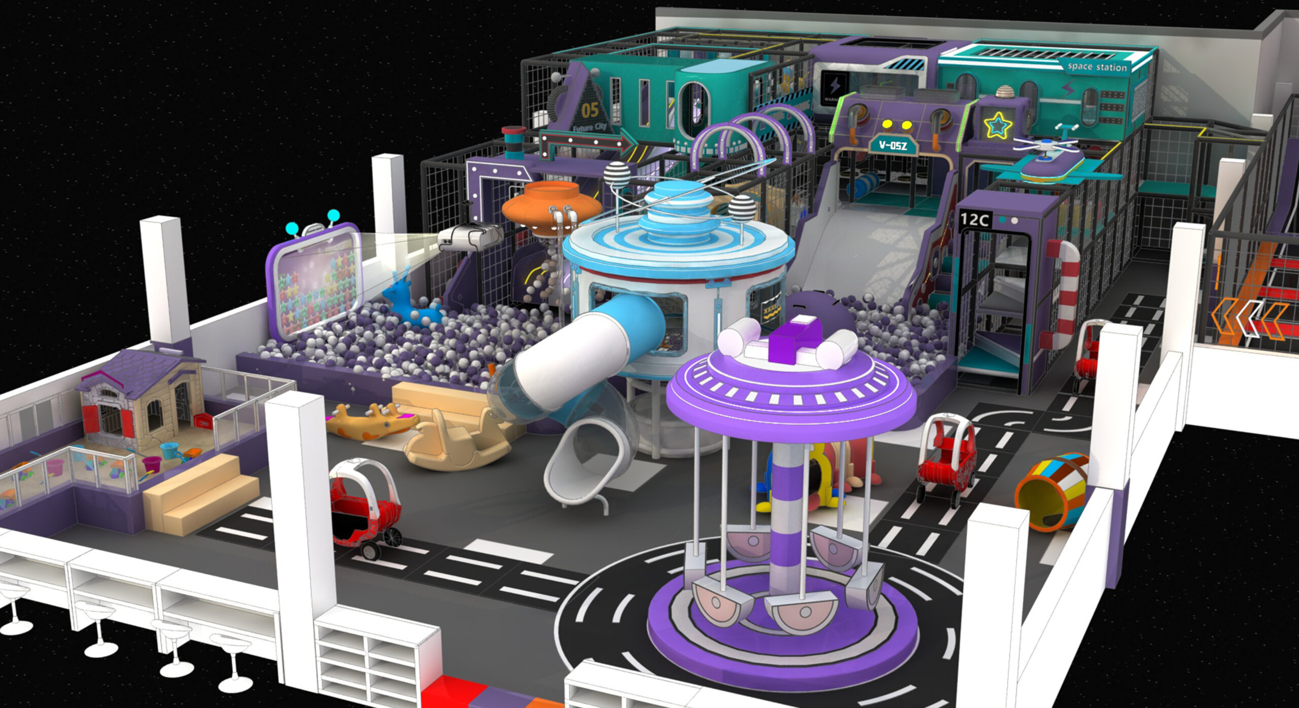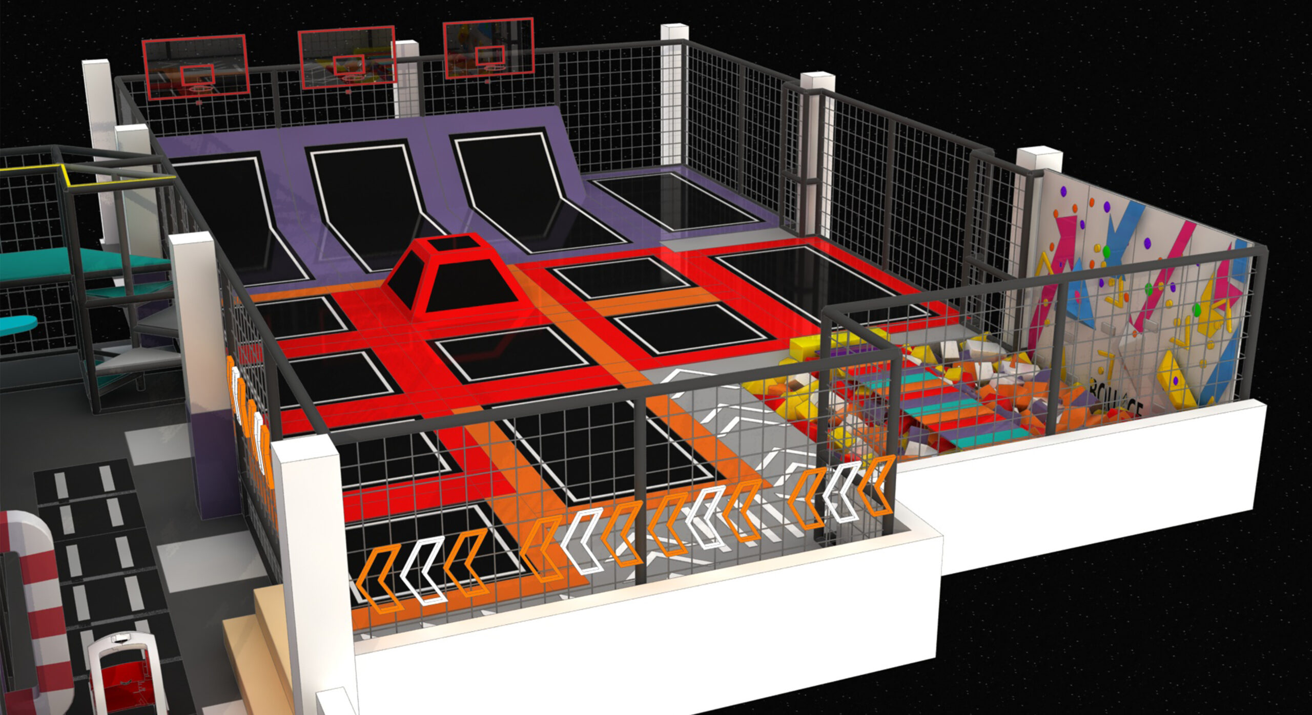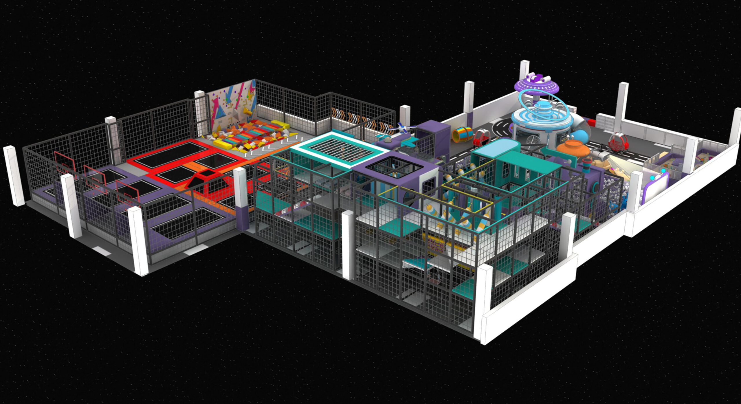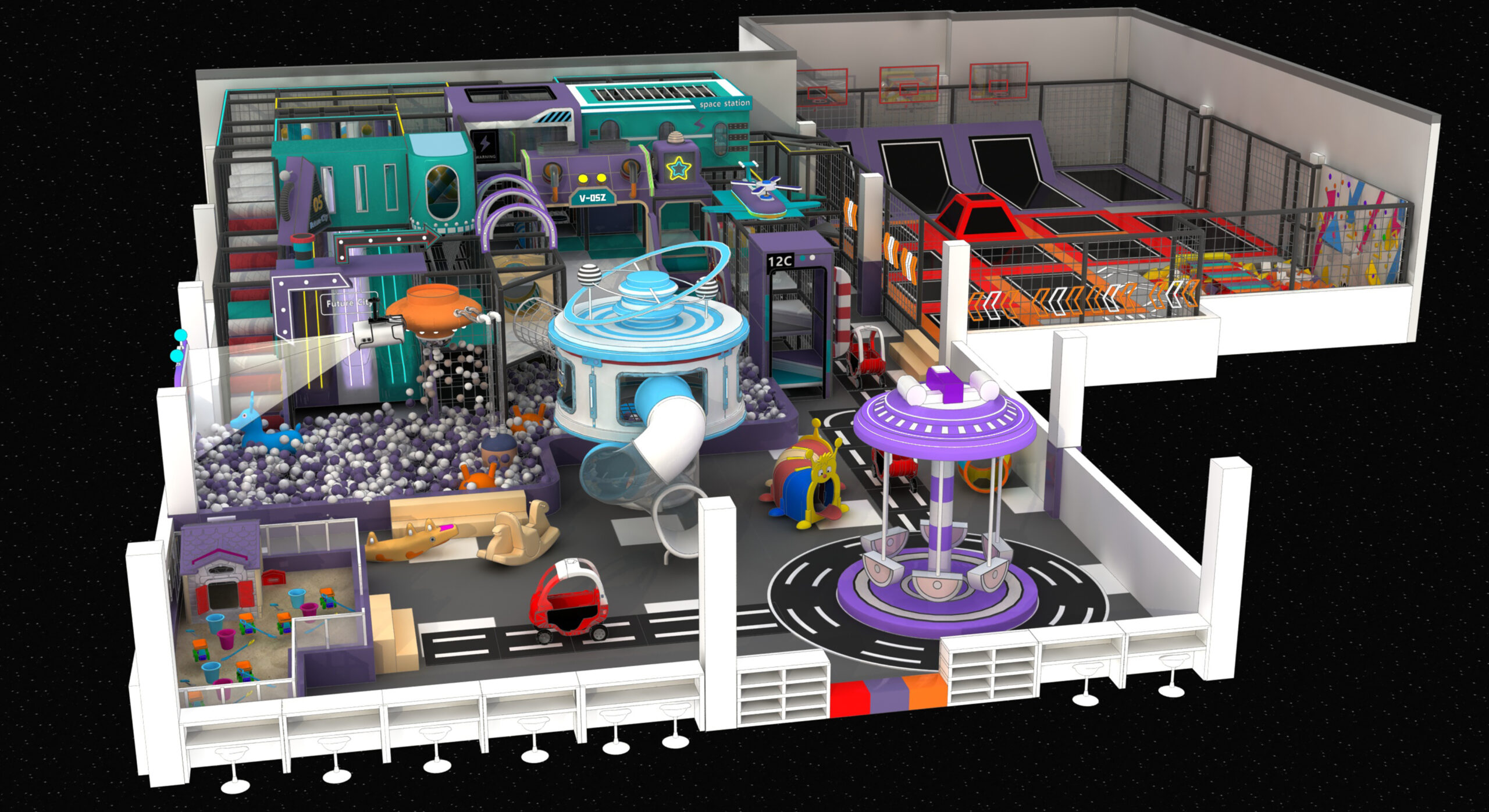 The Space City indoor playground and trampoline park design combines a futuristic space city aesthetic with high-energy trampoline zones and interactive indoor play facilities. Inspired by space stations, the design can be customized to meet any additional requirements.