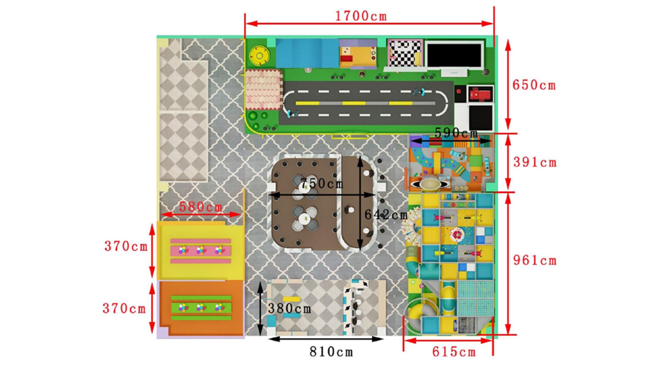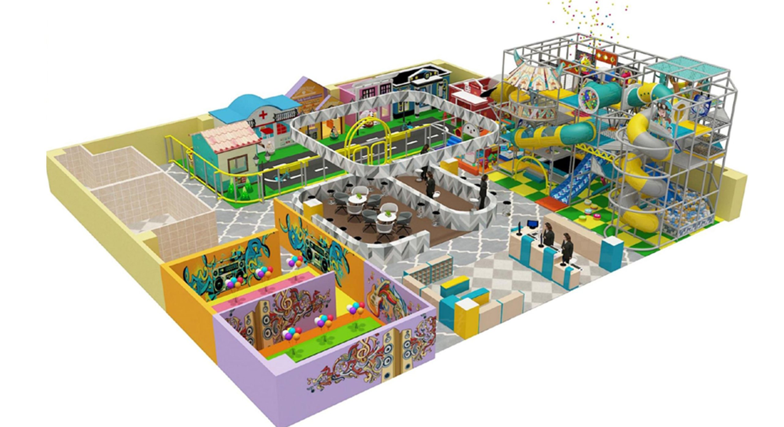 A: It includes a framed maze area, sand pit area, soft pack expansion area, ball pit area, etc.