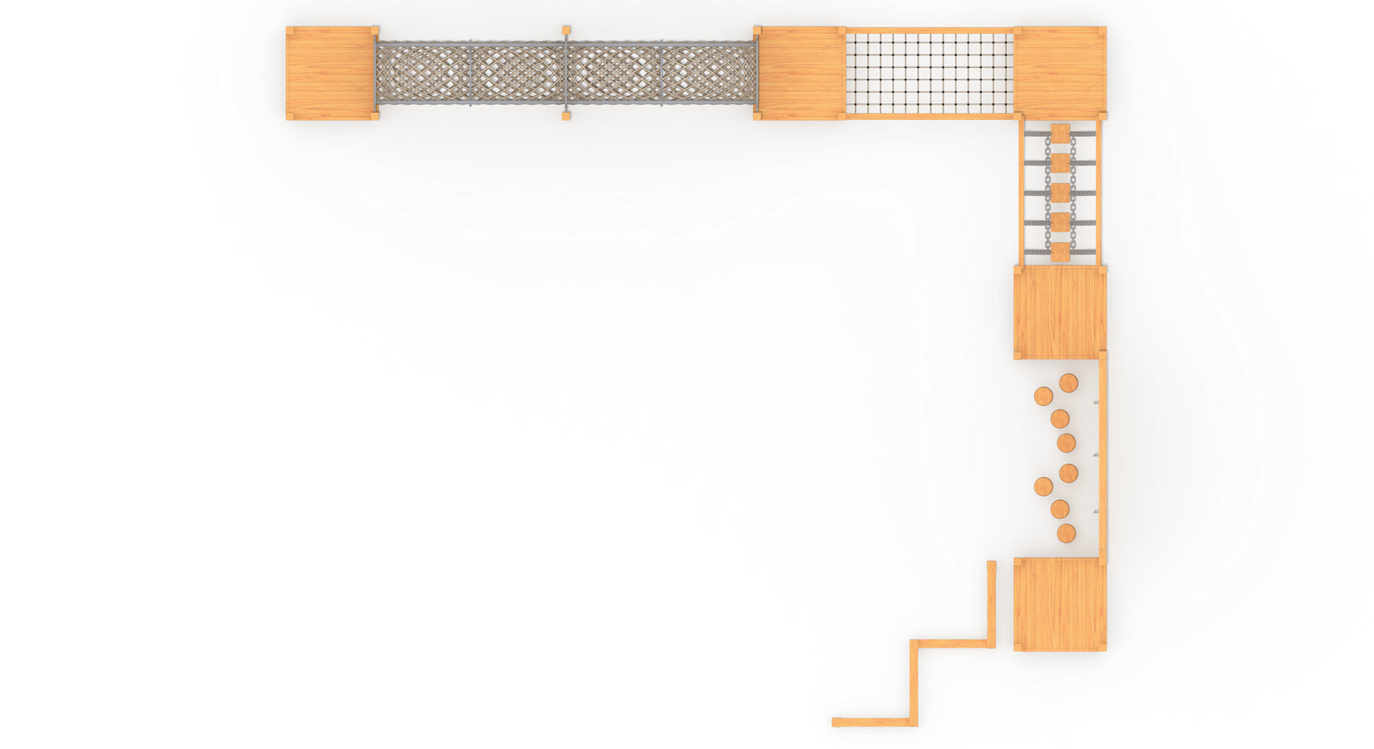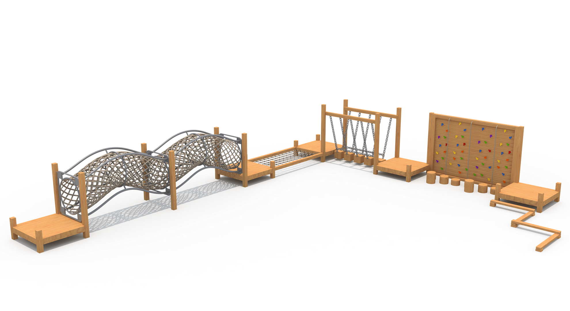 The extended obstacle course concentrates on enhancing physical activity. The first part is a metal drilling network supported by six wooden posts.